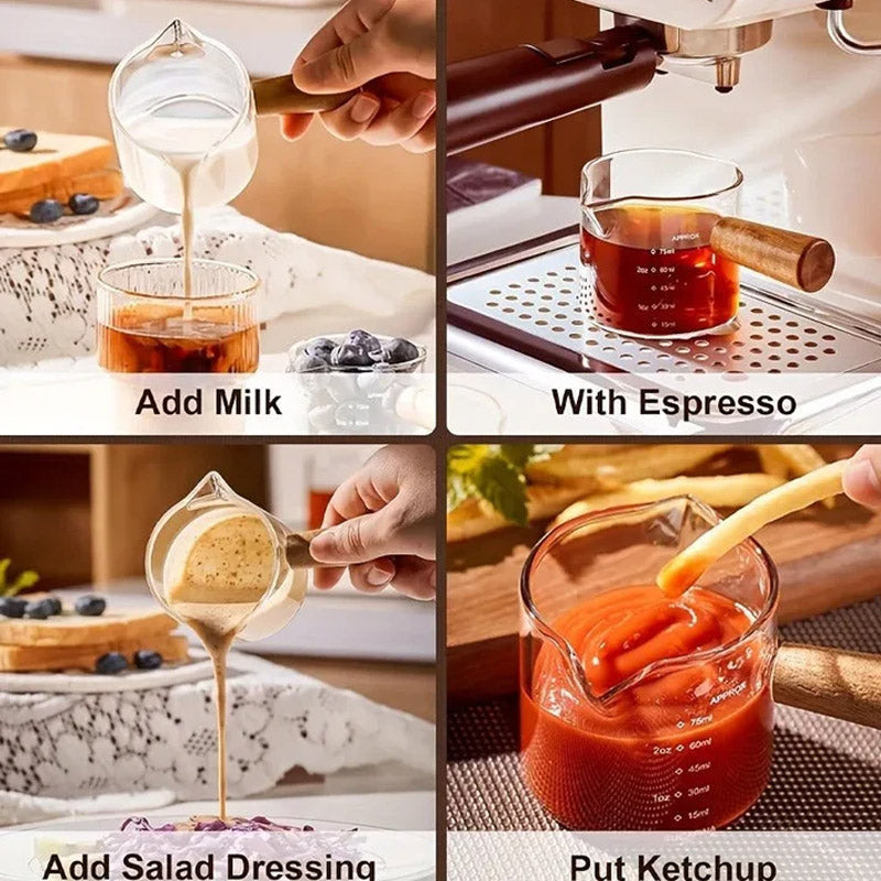 These glass jugs measure cups feature a sleek, transparent design that allows for easy monitoring of liquid levels, ensuring accurate measurements for the perfect espresso shot every time.