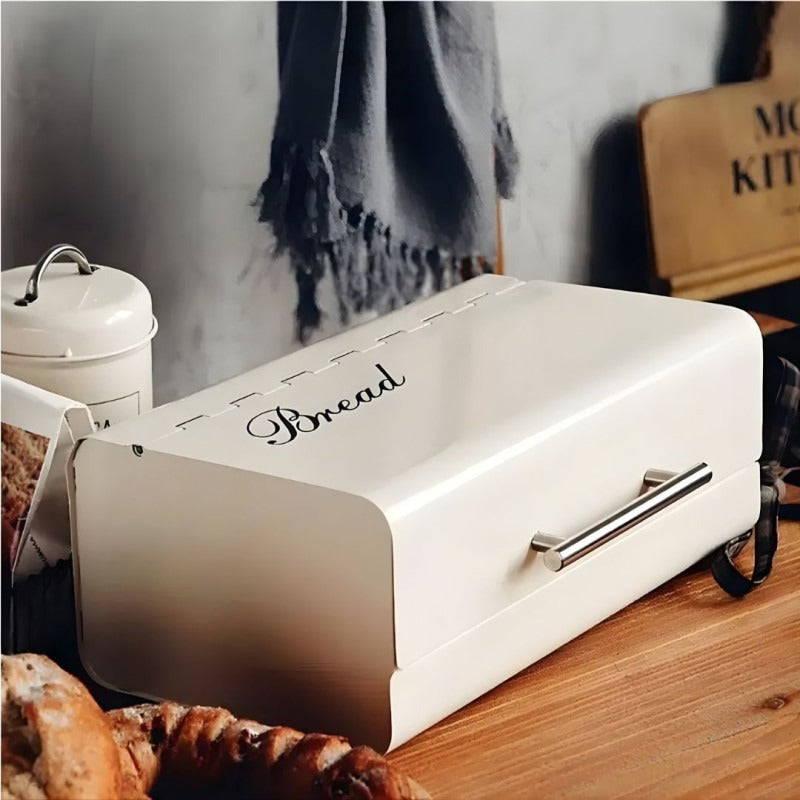 Premium quality metal bread storage box designed to keep bread, buns, and pastries fresh for longer.