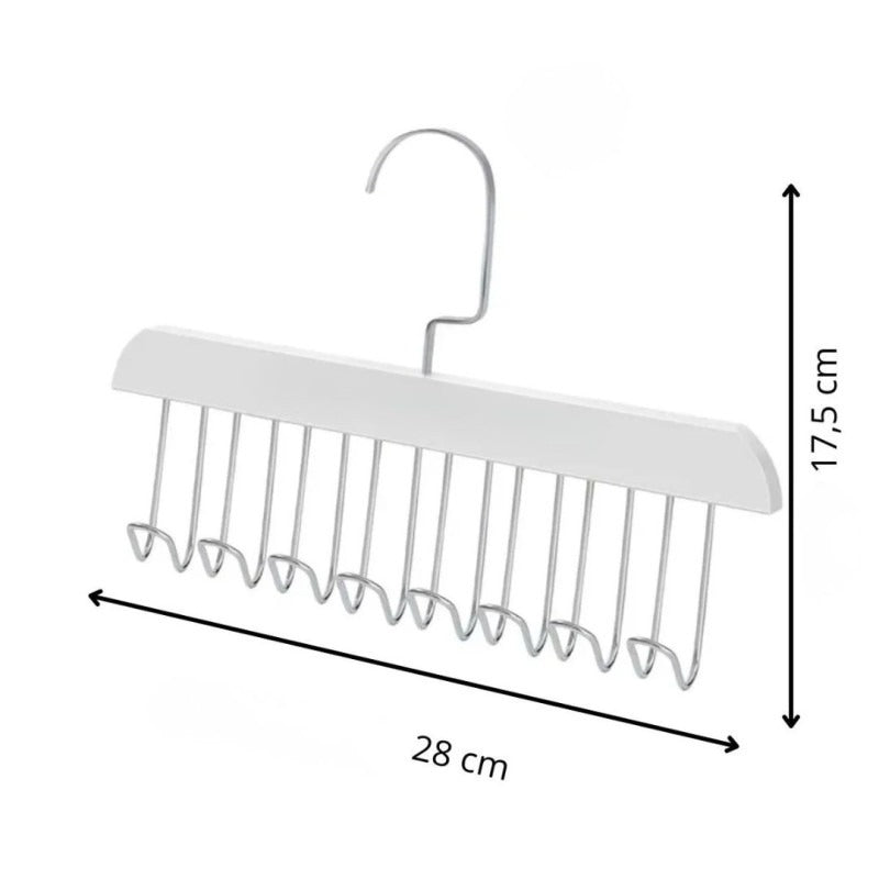 Multi-functional hanger with 8 hooks to organize coats, scarves, hats, belts, and accessories.